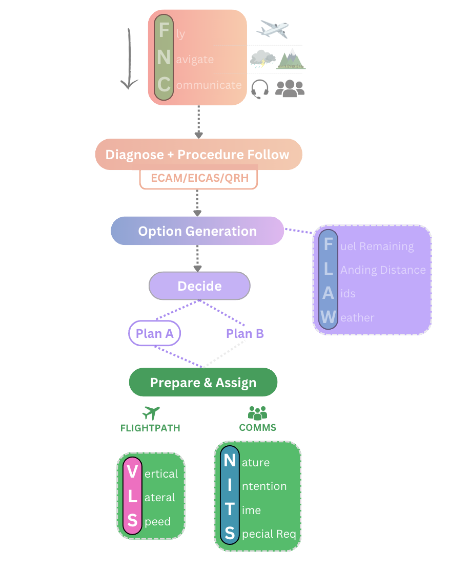 With FNC complete, we now have the capacity to turn our attention to the problem. This step’s about diagnosing the issue, along with following any procedures dictated to us by the ECAM/EICAS or our QRH. There’s not too much to write about here as each diagnosis will be different, but you want to ensure you have a good understanding of what’s happened to the aircraft before moving to the next stage.