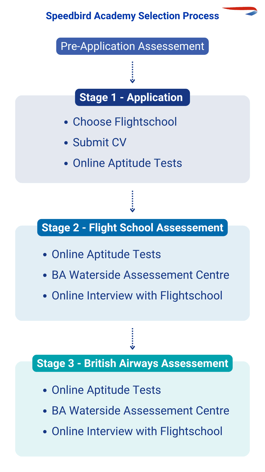 The process this year is slightly different from last year, with a few more stages required before you can actually start your application. Similar to last year, you have the choice of two flight schools, and parts of the selection process will take place with representatives from those schools or at the British Airways HQ. The diagram below shows the overview.