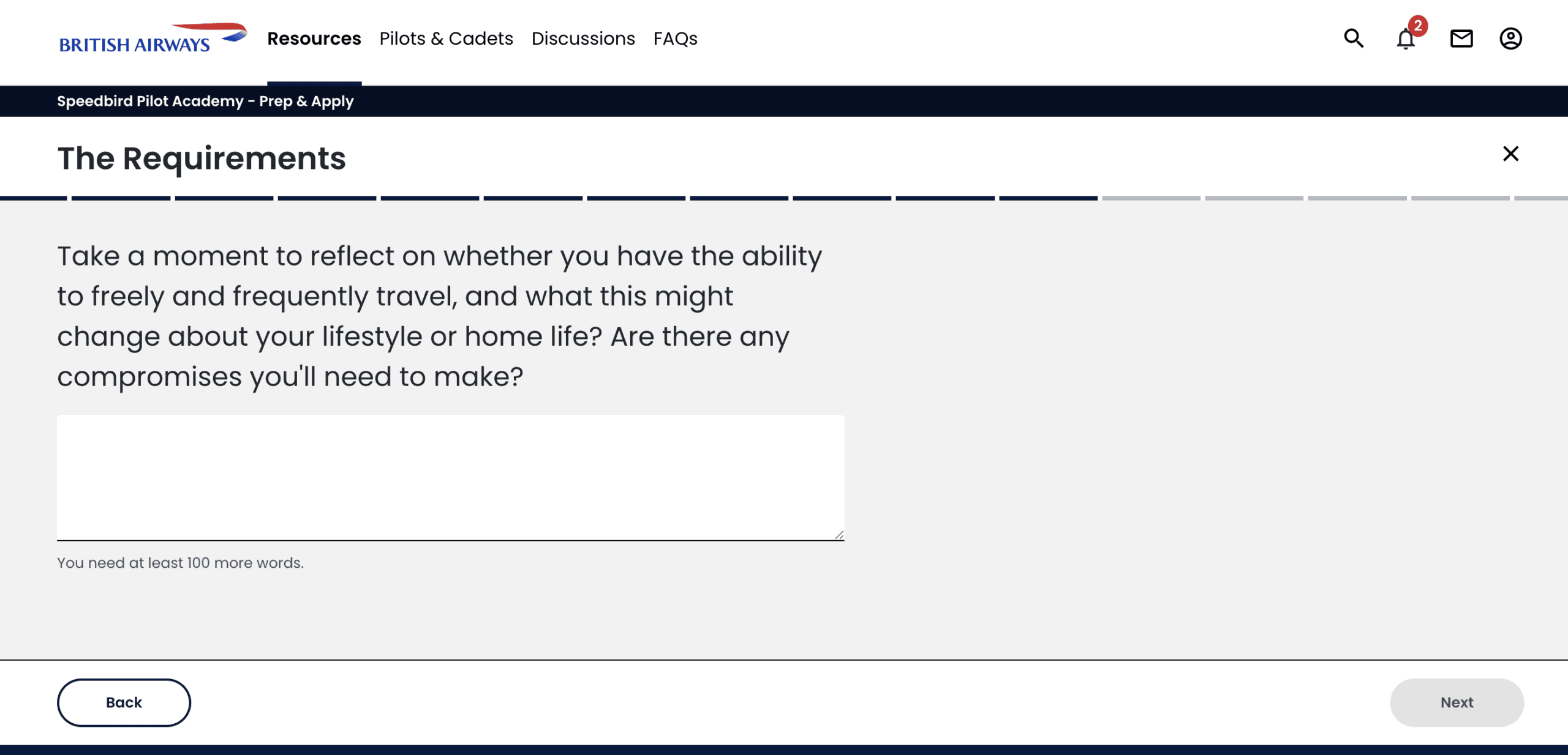 Some of the free-text questions have a 100-word minimum limit, which seems high, given how many questions there are, but I think this is British Airways’ way of weeding out unmotivated people early on. If you don’t have the motivation to write over 100 words for these answers, you likely don’t have what it takes to work through the course.