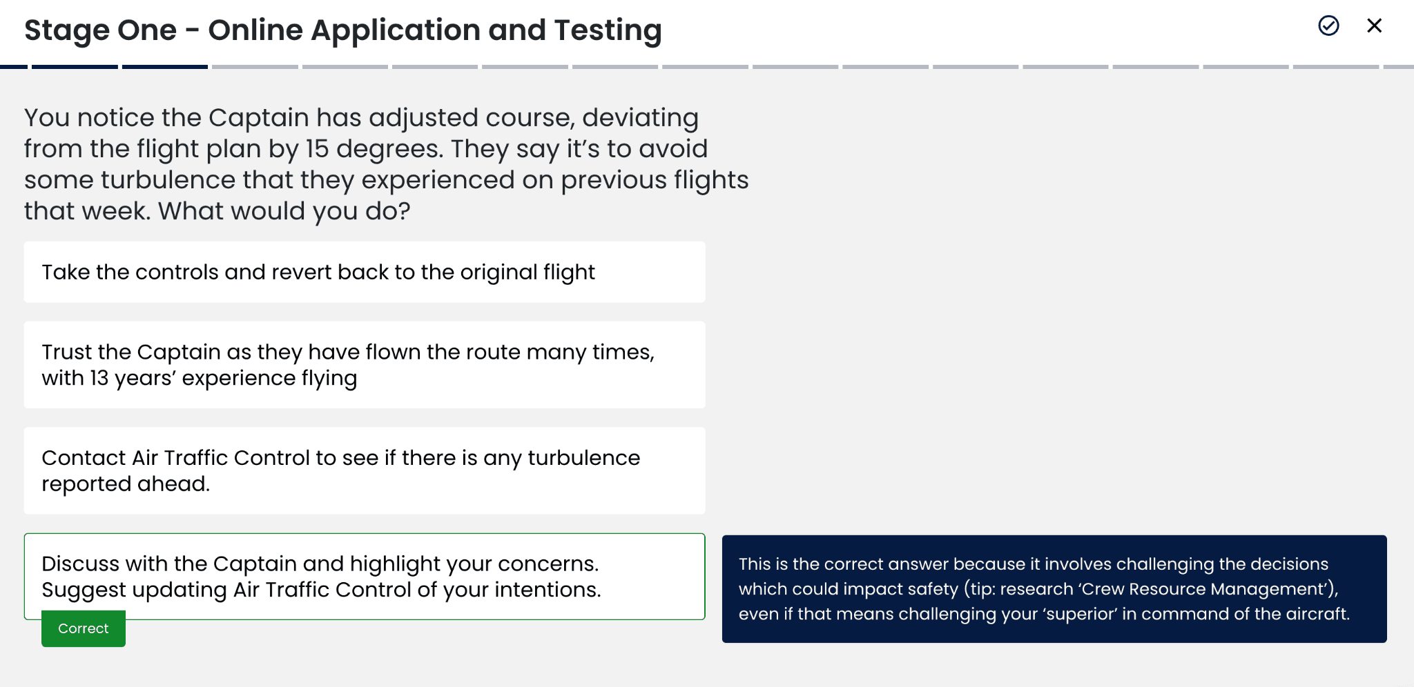 Once you’ve passed the online testing in stage 1, you’re through to, well, more online testing. The joys! The title that British Airways has given to this section is slightly misleading if I’m honest, as the first two parts are still more with the airline than the flight school. This stage is broken down into three stages;